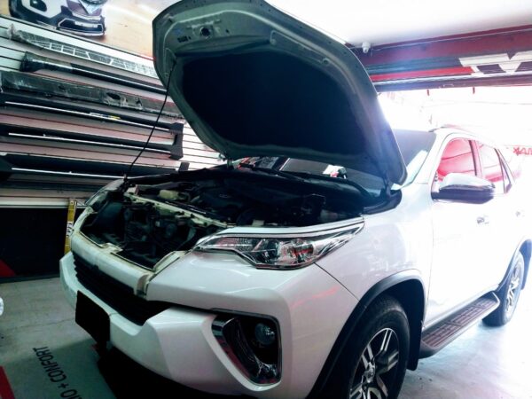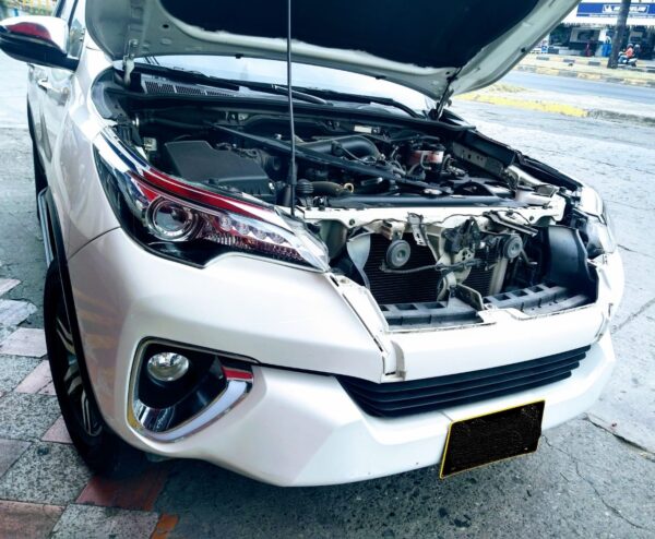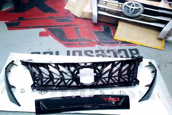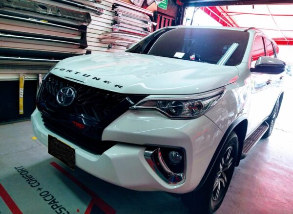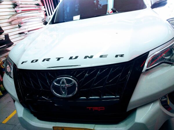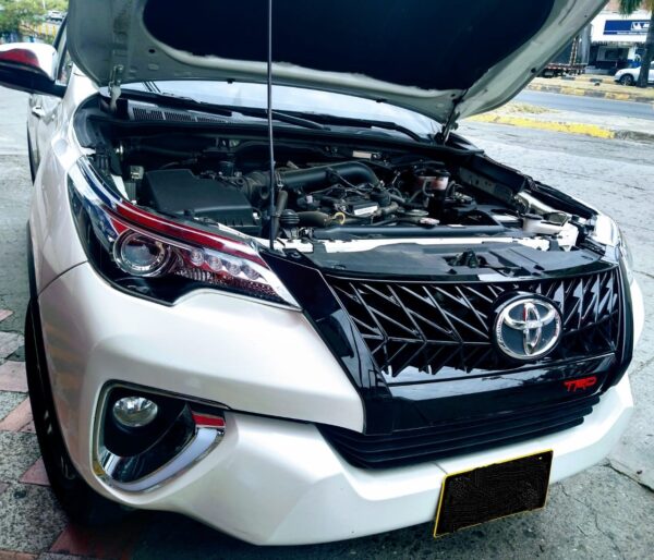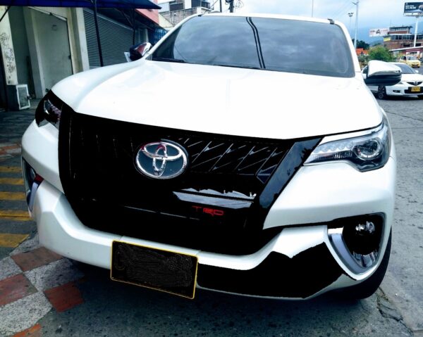 Persiana negro brillante tipo TRD para Toyota Fortuner SW4 con logo central mod. 2017 – 2020, disponible en nuestras instalaciones.